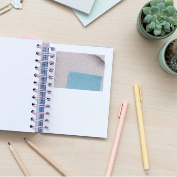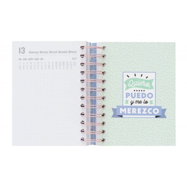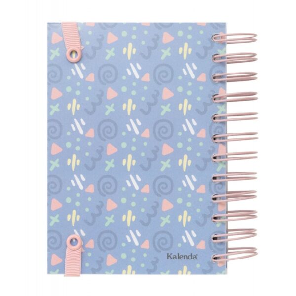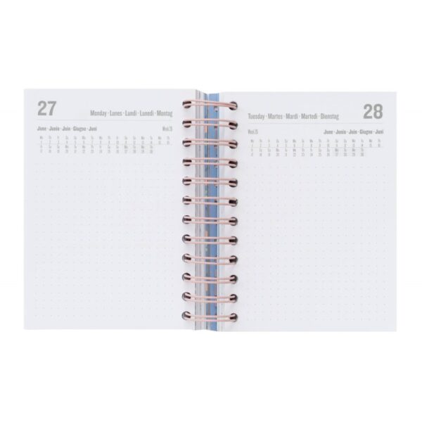 Είναι ελαφριά και μικρή (μέγεθος τσέπης) αλλά παραμένει πρακτική, με αρκετό χώρο, μία σελίδα για κάθε μέρα. Διαθέτει ελαστική ταινία πλάτους 9 mm, για να μένει κλειστή, σε χρώμα ταιριαστό με το σχέδιο. Ακόμα, έχει πλαστικό εξώφυλλο που αλλάζει και πλαστικοποιημένο χρωματιστό διπλό σύρμα σπιράλ.